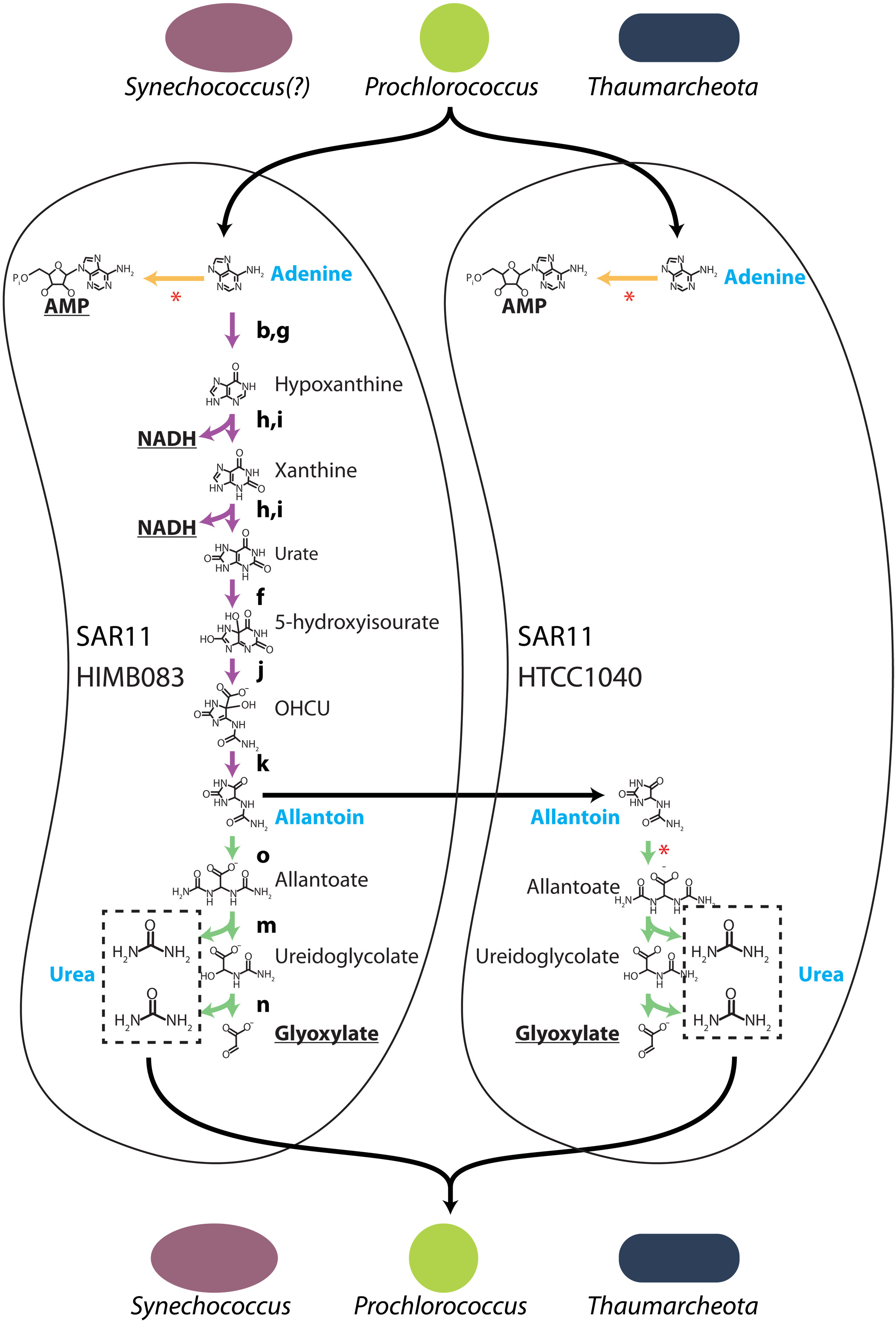 Lastly, I contributed to work linking Prochlorococcus exudates (purines and pyrimidines) and nitrogen specialization by members of Pelagibacter ubique in the global oceans. Prochlorococcus rhythmically exudes purines and pyrimidines, likely related to daily genome replication. Co-occurring heterotrophs appear to specialize in consuming these exudates either as generalists or purine/pyrimidine specialists, which supports elemental cycling and emerging cryptic nitrogen loops across ocean regions. While these hypotheses could be gleaned from sequencing data, we further utilized a pure culture of Pelagibacter ubique) and media amendments of adenine to demonstrate delayed DNA synthesis, supportive of the hypothesis that marine heterotrophs sync replication to the timing of photosynthate availability from phytoplankton like Prochlorococcus.