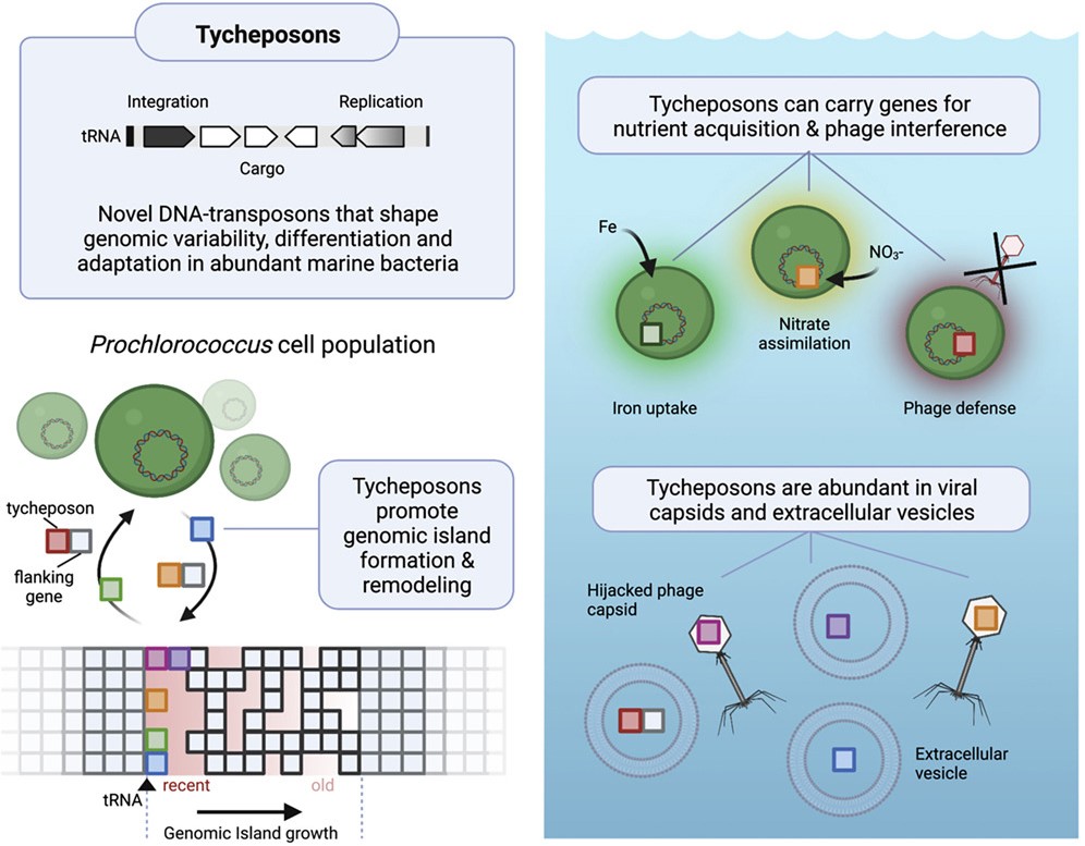 In terms of Prochlorococcus as a driver of genetic diversity, I first contributed to work describing cyanophage mispackaging of host genome, a possible mechanism of horizontal gene transfer in the global oceans. At higher light levels, such as in surface waters, we proposed that the rate of protein synthesis may outpace phage genome replication. In infected cells, this imbalance could increase the frequency with which phage capsids are mispackaged with fragments of host DNA instead of viral genomes. In separate work, we described tycheposons, a novel family of mobile genetic elements that drive genomic plasticity in Prochlorococcus and related marine microbes. These elements integrate at tRNA genes, carry adaptive cargo (such as nutrient assimilation genes), and can spread via extracellular membrane vesicles and phage particles, offering a new mechanism for horizontal gene transfer in the oceans.